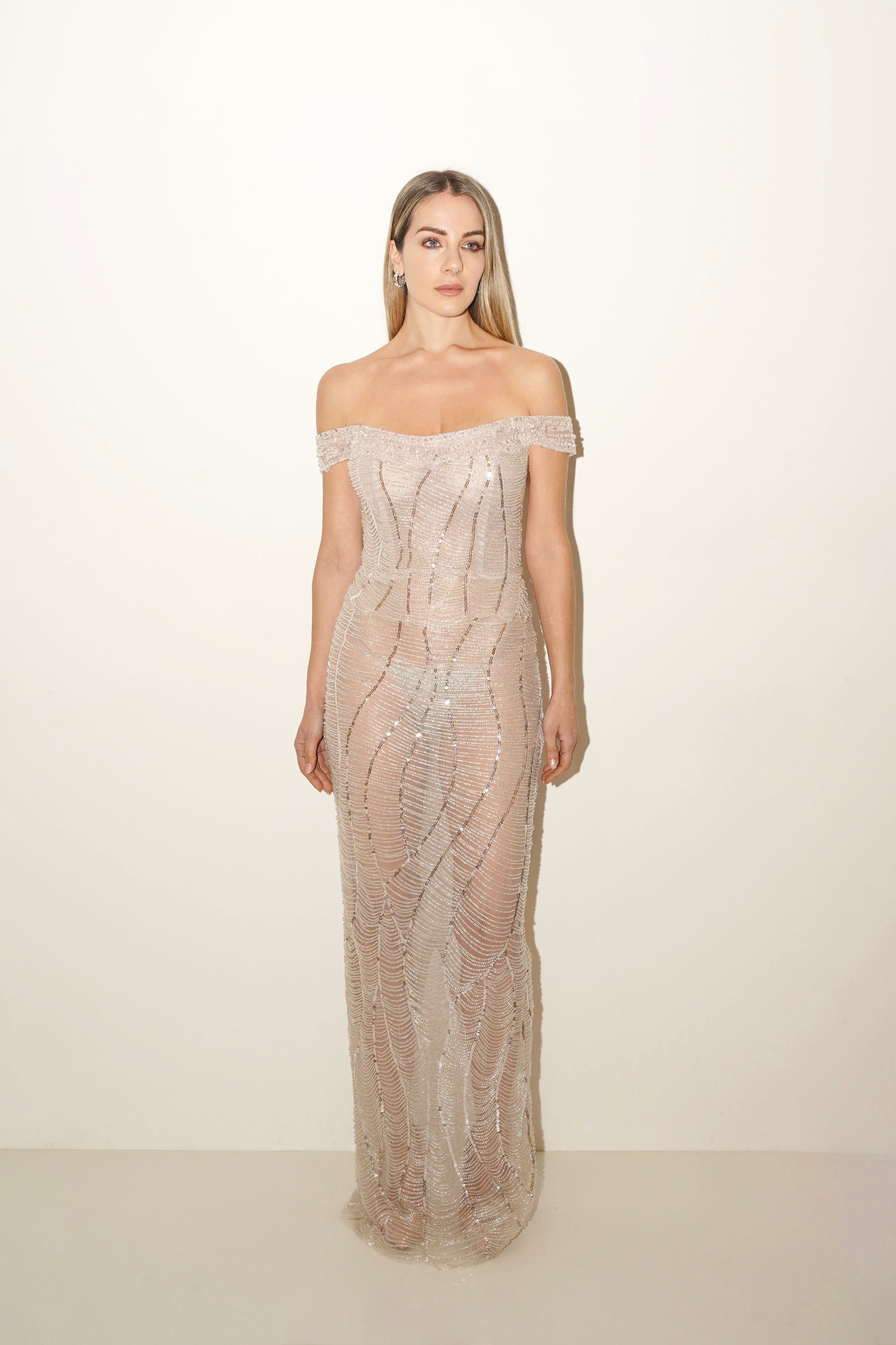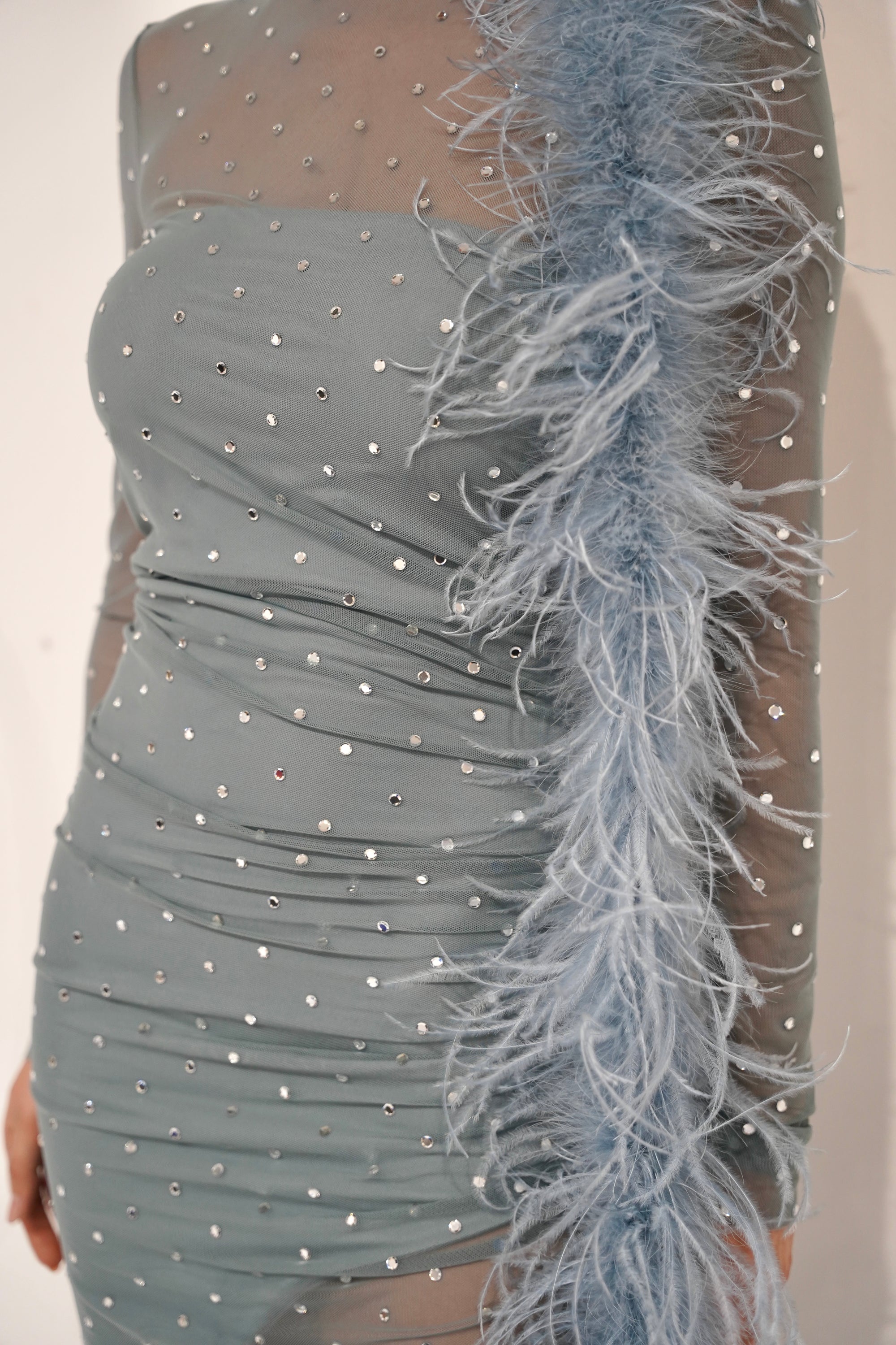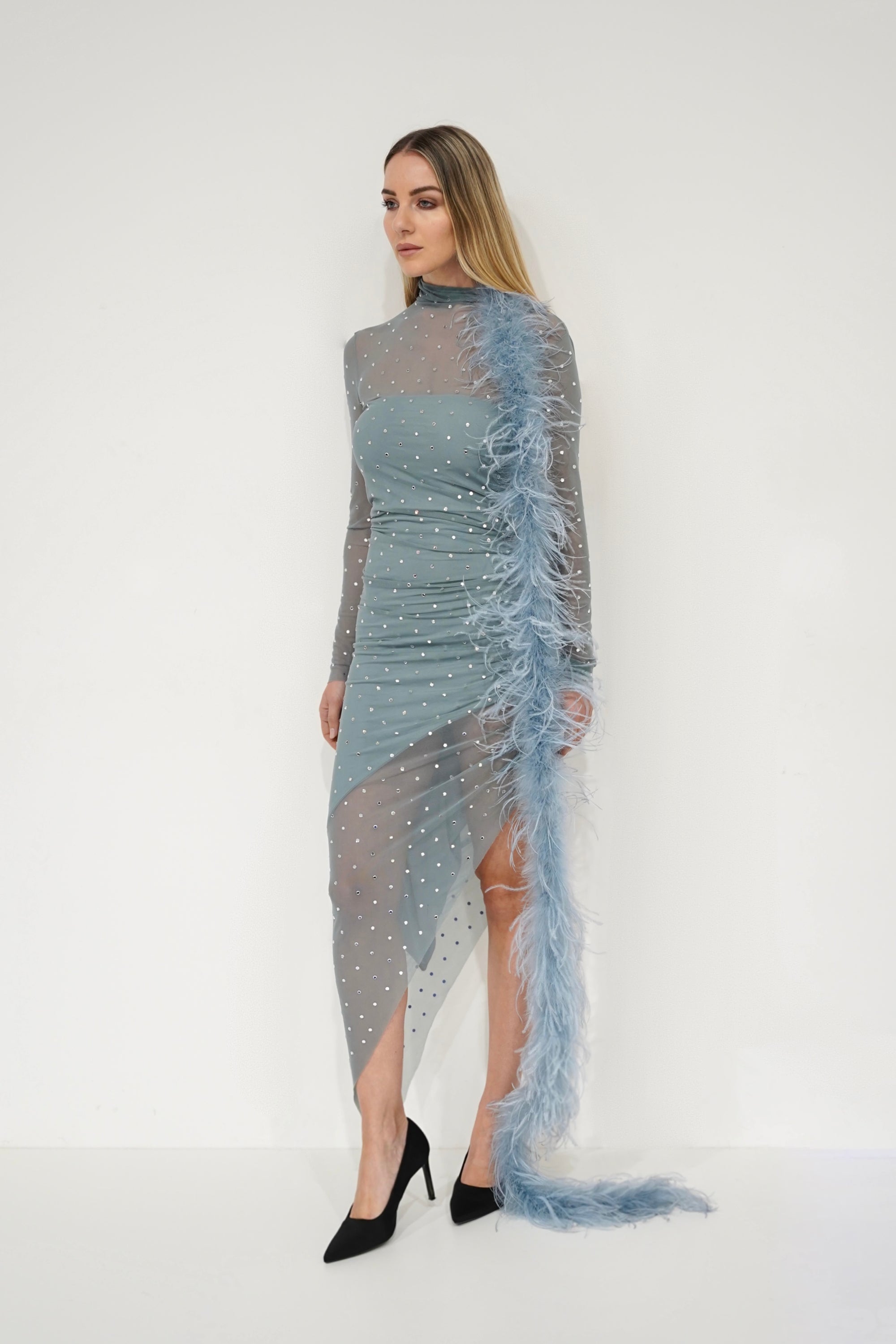 Abito Lungo in Tulle con Strass e Dettaglio Piume