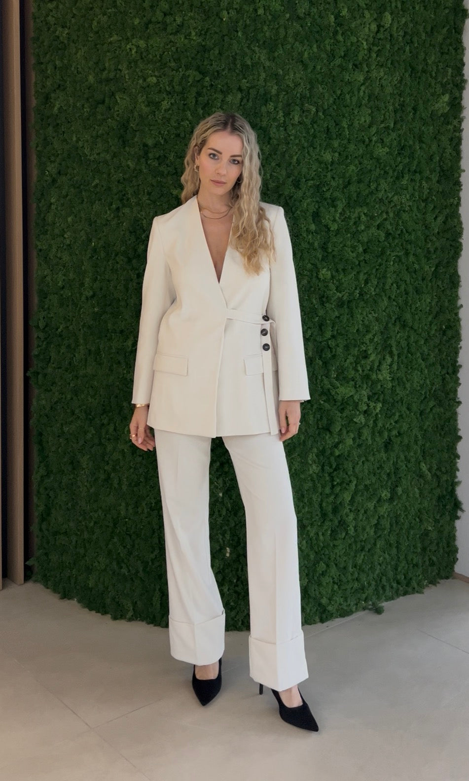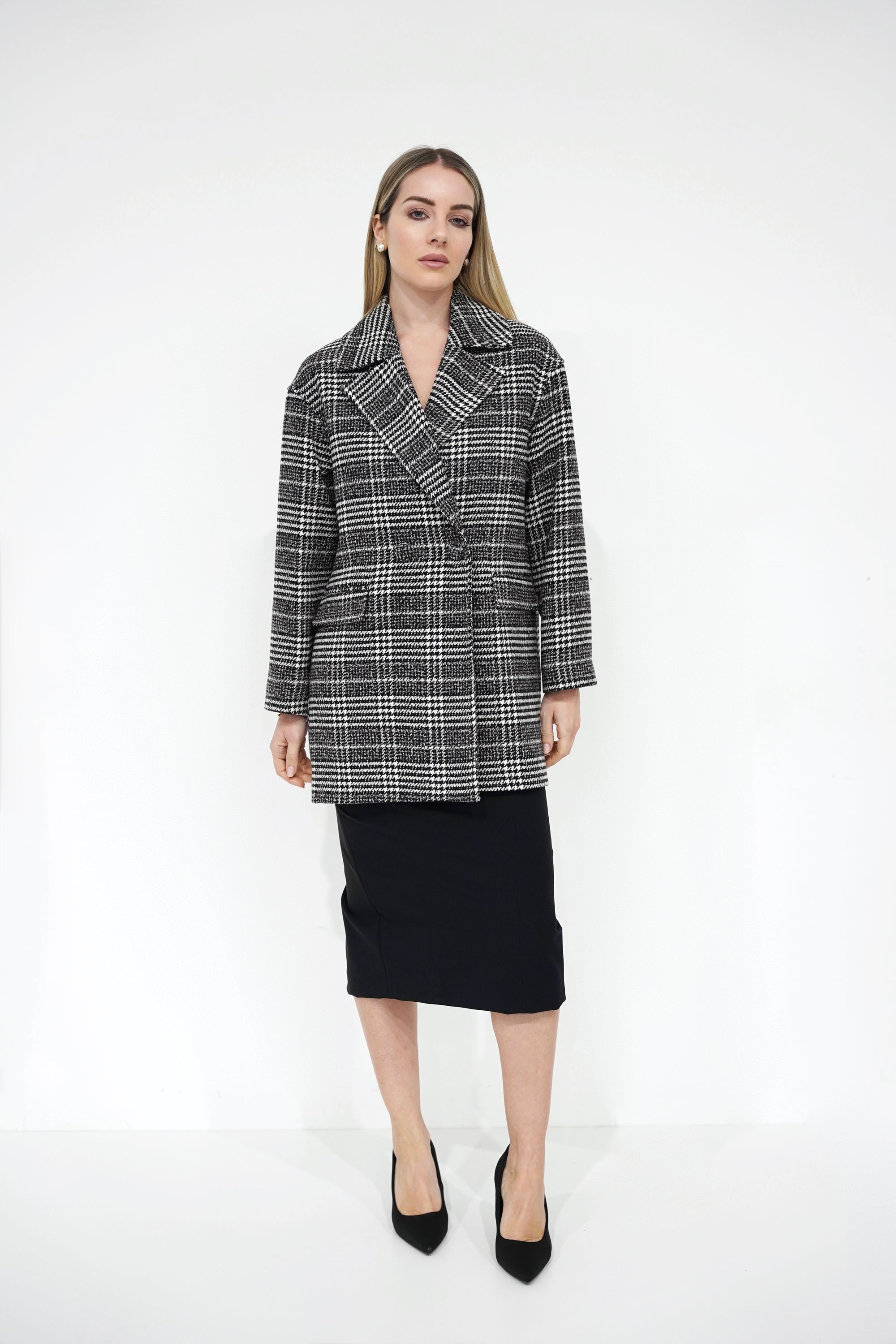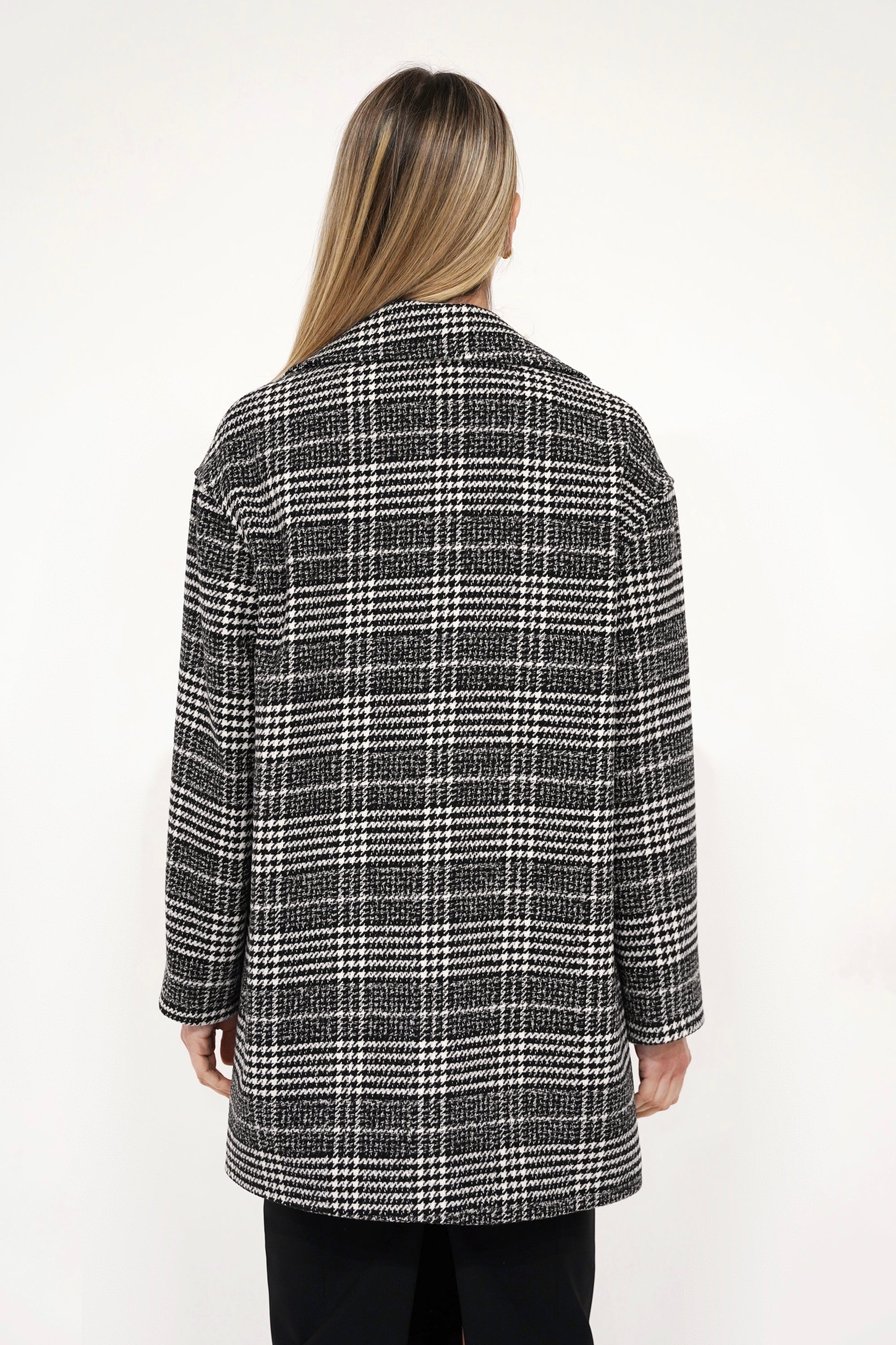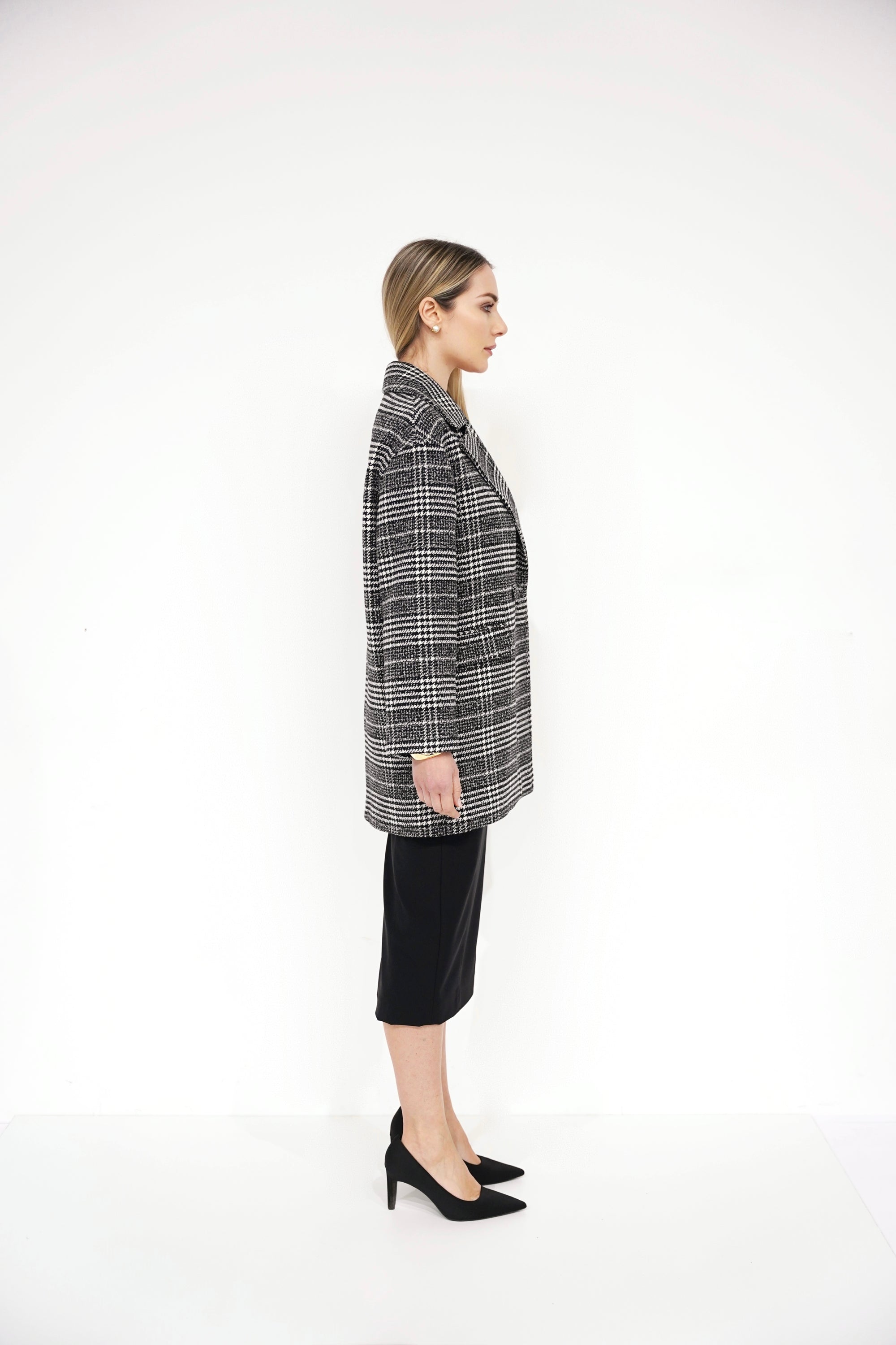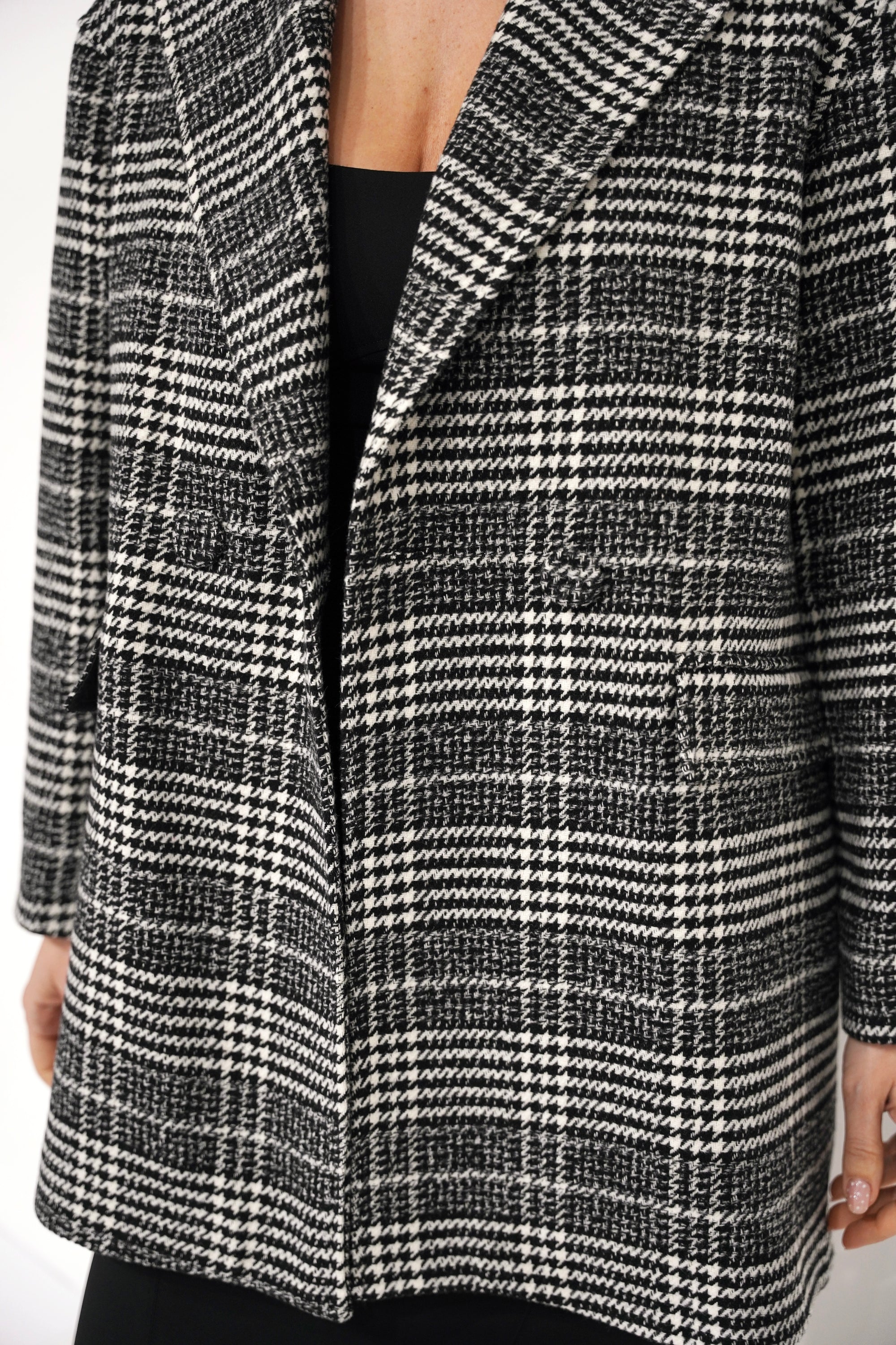 La giacca check incontra toni neutri e dettagli raffinati, creando un mood che sa essere professionale e chic allo stesso tempo.