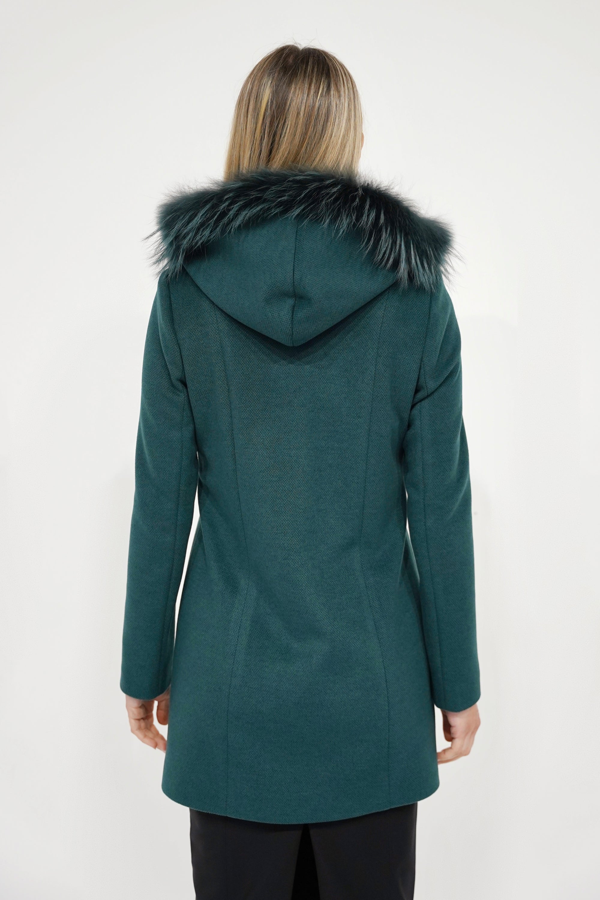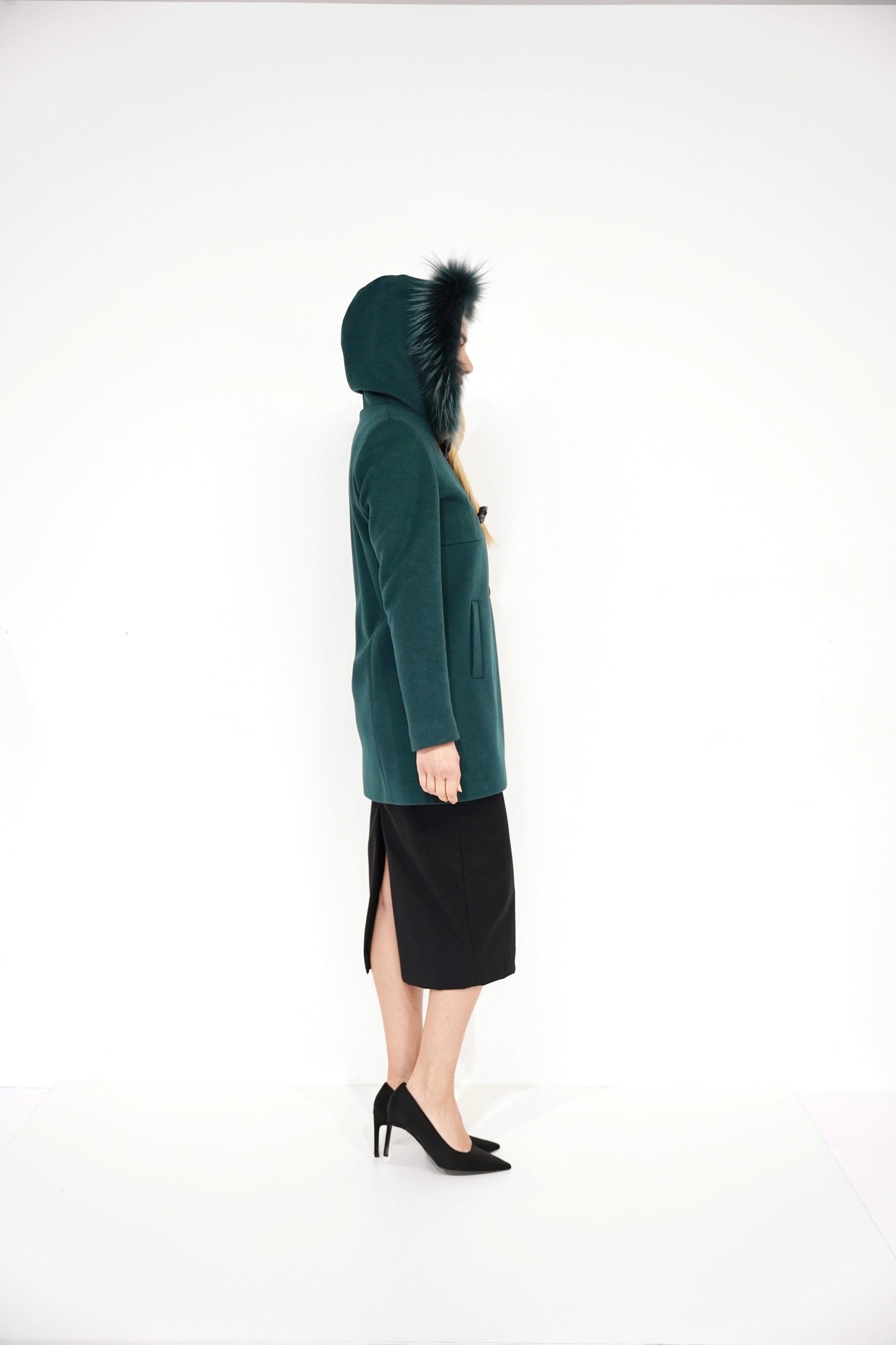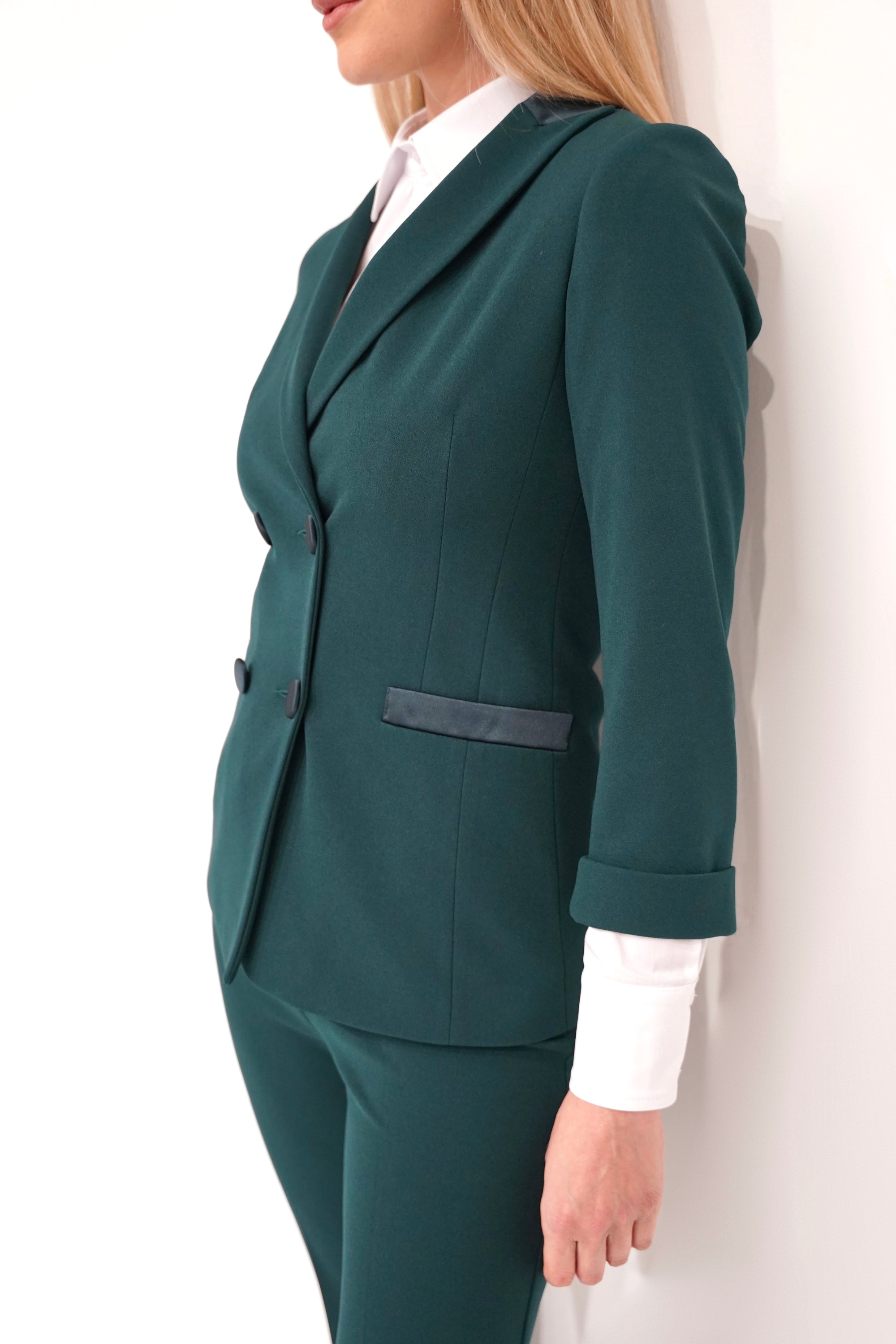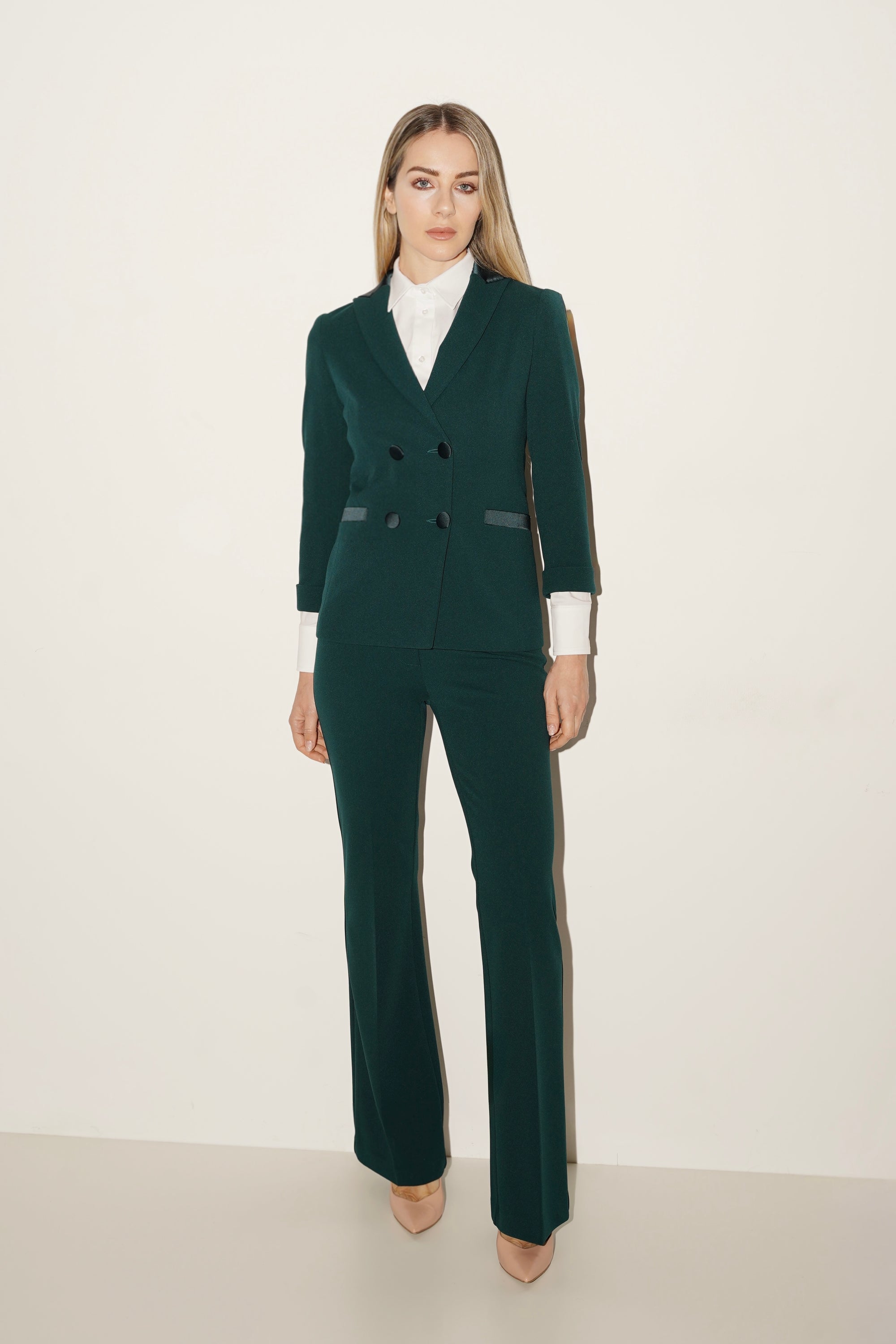 Il verde petrolio scolpisce la silhouette con eleganza naturale e un’allure contemporanea.